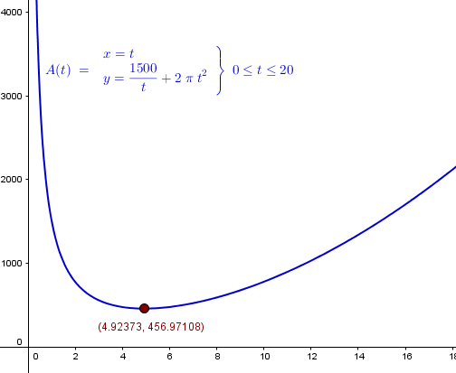 $$\begin{align}&A(r)=2\pi r\left(\frac{750}{\pi r^2}+r \right)=\frac{1500}{r}+2\pi r^2\\&\\&\text{derivamos e igualamos a 0}\\&\\&A'(r)=-\frac{1500}{r^2}+4\pi r=0\\&\\&\text{multiplicamos por r^2}\\&\\&-1500+4\pi r^3=0\\&\\&4\pi r^3=1500\\&\\&r^3= \frac{375}{\pi}\\&\\&r=\sqrt[3]{\frac{375}{\pi}}\approx 4.923725109\,cm\\&\\&h=\frac{750}{\pi \sqrt[3]{\frac{375^2}{\pi^2}}}=\frac{750}{\sqrt[3]{375^2\pi}}=\frac{30}{\sqrt[3]{9\pi}}\approx \\&9.847450218cm\\&\\&\text{El área mínima es}\\&\\&A\left(\sqrt[3]{\frac{375}{\pi}} \right)=\frac{1500}{\sqrt[3]{\frac{375}{\pi}}}+2\pi\left(\sqrt[3]{\frac{375}{\pi}} \right)^2\approx\\&\\&456.9710839cm^2\end{align}$$