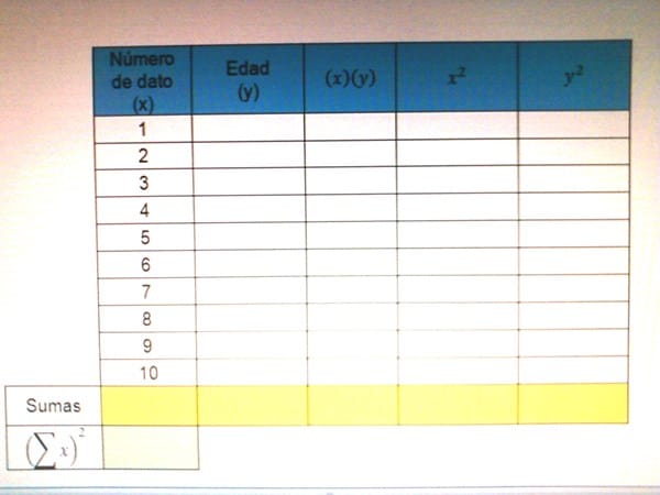 $$\begin{align}&Número de dato (x): Se escriben los números con los que enumeraste los datos.\\&Edad (y): Se escribe la edad que le corresponde a cada dato.\\&(x)(y): Se escribe el resultado de multiplicar el valor de (x) por el valor de (y)\\&x^2:Se escribe el resultado de elevar al cuadrado el valor de (x)\\&y^2 : Se escribe el resultado de elevar al cuadrado el valor de (y)\\&\end{align}$$- Excel para elaborar esta tabla y obtener los resultados solicitados.