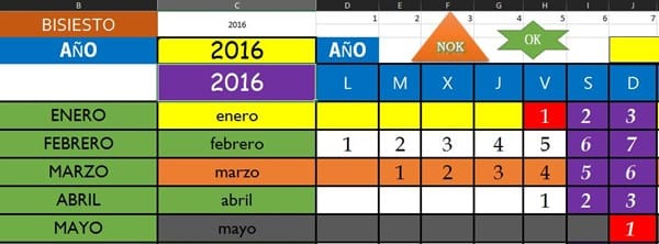d6("Enero"), del boletín=b4(tabla coloreada). Me busque "1" en la tabla coloreada y me devuelva el día de semana(L, M, X, J, V, S, D), en B9 del boletín, y a poder ser que se rellene hasta B15(del boletín) con los siguientes días. Gracias y un saludo. CARPE DIEM