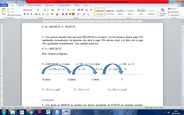 2.- Una persona depositó hace seis años $200, 000.00 en un banco. Los tres primeros años le pago 21% capitalizable mensualmente, los siguientes dos años le pago 19% efectivo anual, y el último año le pago 14% capitalizable bimestralmente. Que cantidad recibe hoy.