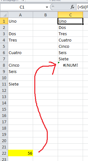 =SI(FILAS(C$1:C1)>CONTARA(A:A); ""; INDICE(A:A; K.ESIMO.MENOR(SI(A$1:A$11<>"";FILA(A$1:A$11));FILAS(C$1:C1))))