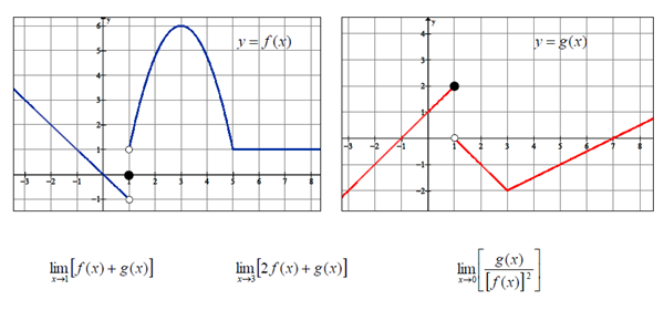 $$\begin{align}&\lim_{x \to 1^-}(f(x)+g(x)) = \\&\lim_{x \to 1^-}f(x) +\lim_{x \to 1^-}g(x)=-1+2 = 1\\&\\&\lim_{x \to 1^+}(f(x)+g(x)) = \\&\lim_{x \to 1^+}f(x) +\lim_{x \to 1^+}g(x)=1+0 = 1\\&\\&\text{Como ambos coinciden, entoces existe el límite}\\&\lim_{x \to 1}(f(x)+g(x)) = 1\\&\\&--------------------\\&\\&\lim_{x\to 3}(2f(x)+g(x))=\\&\\&\text{Usando las propiedades de los límites}\\&\\&=2 \lim_{x\to 3}f(x)+\lim_{x\to 3}g(x)=\\&\\&\text{en x=3 las dos son continuas y existe el límite}\\&\\&=2·6+(-2) =10\\&\\&--------------------\\&\\&\lim_{x\to 0} \frac{g(x)}{[f(x)]^2}\\&\\&\text{vemos que g(0)=1 y f(x)=0}\\&\text{Luego es de la forma }\frac 10=\infty\\&\text{pero podemos añadir algo más}\\&[f(x)]^2 \gt0\quad \forall x \in \mathbb R-\{0\}\\&g(0)=1\gt 0\\&\\&\text{luego el cociente es siempre positivo,}\\&\text{por lo tanto tiende a }+\infty \text{ por los dos lados}\\&\\&\lim_{x\to 0} \frac{g(x)}{[f(x)]^2}=+\infty\end{align}$$: