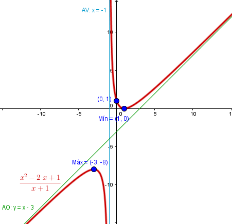 $$\begin{align}&\lim_{x\to \infty}(f(x)-mx)=\\&\\&\lim_{x\to \infty}\left(\frac{x^2-2x+1}{x+1}-x \right)=\\&\\&\lim_{x\to \infty}\left(\frac{x^2-2x+1-x^2-x}{x+1} \right)=\\&\\&\lim_{x\to \infty}\left(\frac{-3x+1}{x+1} \right)=-3\\&\\&\text{Luego la asíntota oblicua es}\\&\\&y=x-3\end{align}$$Y he hecho muchas cosas para la gráfica, pero será un programa el que la haga