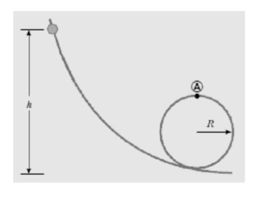Dando un giro completo. Si la cuenta se suelta desde una altura h=350R. ¿Utilice el teorema de la conservación de la energía para determinar su velocidad en el punto A?