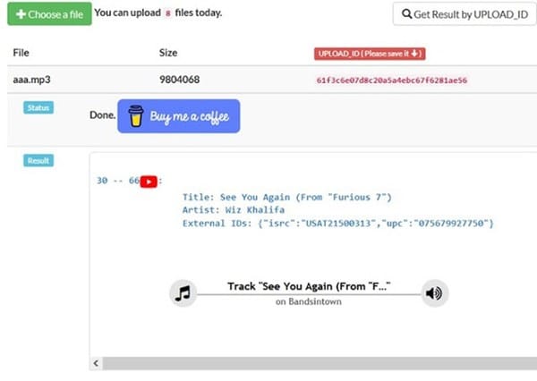 Excepto el software anterior, también puede utilizar el identificador de música en línea para identificar canciones en línea. Vaya a ACRCloud Music Recognition y luego elija un archivo para cargar. Identificará automáticamente las canciones y mostrará el resultado en la interfaz.