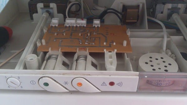 Por lo que veo, lleva dos tetones para marcar la posición y tres grapas para sujetar la placa. Desconecta el aparato de la toma de corriente, desconecta los conectores de la placa, márcalos o hazles una foto. Retiras las grapas hacia atrás con cuidado de que no se te rompan y levantas la placa. A veces llevan un poco de pegamento, con ayuda de un destornillador, la vas levantando poco a poco hasta que esté libre. Los botones de la placa parecen estar debajo de ella, me da la sensación de que cuando pulsas el botón externo, no llegas a activar el contacto de la placa por el motivo que sea.