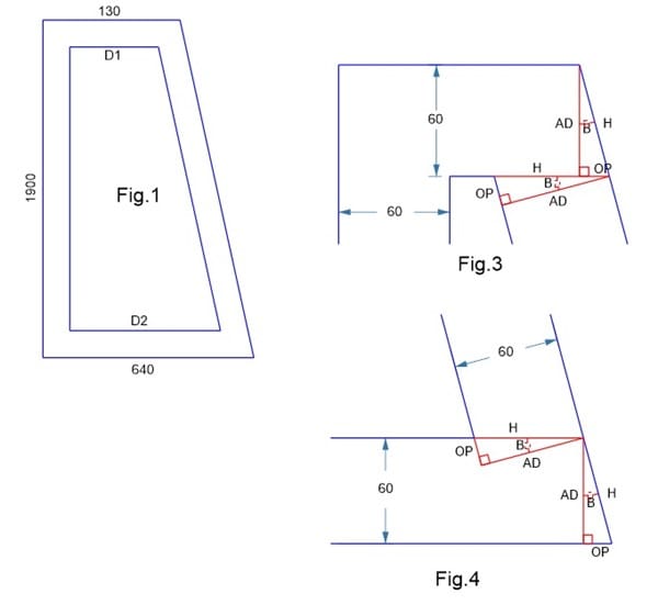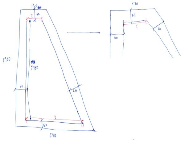 Tengo las medidas de la figura exterior y debo generar una figura interior separada por 60 por lado. No tengo más medidas que las que se adjuntan en la imagen. ¿Cómo puedo saber cuánto medirían los lados de la figura interior marcados en rojo?
