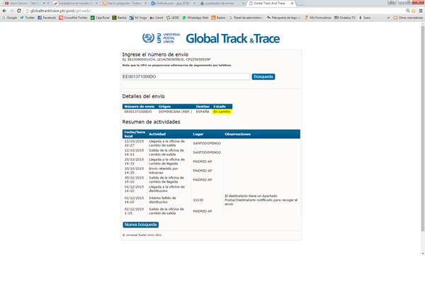 Mi problema empieza desde el día 12/10/2015, que mi hermano me envió un paquete desde República Dominicana hacia España, todo iba bien hasta que me inquieta la llegada del paquete por su tardanza en la entrega aquí en España (llego el día 20/10/2015), con lo que me encuentro que este esta retenido en Aduanas Madrid-Barajas y necesita declarar el paquete e identificar su contenido. No obstante, el 27/10/2015 realizo todo el papeleo correspondiente que me notifican paso a paso, hasta que llega el momento del presupuesto el cual me toca supuestamente pagar una cantidad de 120 Euros aproximadamente, lo cual decido que el paquete sea devuelto a origen en este caso República Dominicana y notifico a mi hermano de la situacion, entre todo ese proceso pasa todo el mes de Noviembre y no es hasta el 02/12/2015 donde estas personas envían el paquete devuelta desde España hacia República Dominicana,