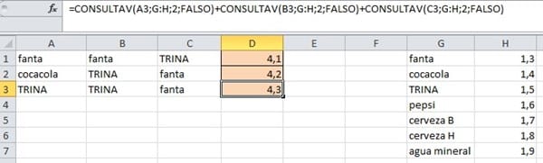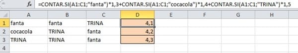 (=CONTAR.SI(A1:C1;"fanta")*1,4;=CONTAR.SI(A1:C1;"cocacola")*1,50;CONTAR.SI(A1:C1;"TRINA")*1,30)