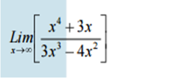 $$\begin{align}&\lim_{x\to \infty} \frac{x^4+3x}{3x^3-4x^2}=\lim_{x\to\infty}\frac{1+\frac 3{x^3}}{\frac 3x-\frac{4}{x^2}}=\frac{1+0}{0-0}=\frac 10=\infty\\&\\&\text{Y el signo como decíamos antes}\\&\frac{sgn(\infty^4)}{sgn(3\infty^3)}= \frac +0=+\\&Luego\; L = +\infty\\&\\&\text{Tambíen puedes dividir por la potencia menor entre}\\& \text{grado del numerado y denominador, entonces por }x^3\\&\\&\lim_{x\to \infty} \frac{x^4+3x}{3x^3-4x^2}=\lim_{x\to\infty}\frac{x+\frac{3}{x^2}}{3-\frac 4x}=\frac{+\infty}3=+\infty\\&\\&\text{Esta segunda forma deja más claro el tema del signo.}\end{align}$$Y esto es todo, espero que te sirva y lo hayas entendido.