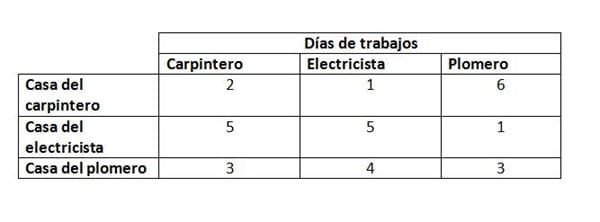 Tres habitantes de un conjunto cerrado dueños de su casa, cuyas profesiones son: un carpintero, un electricista y un plomero, llegan al acuerdo de hacer reparaciones necesarias en las tres casas, y deciden trabajar en total diez días cada uno, así :