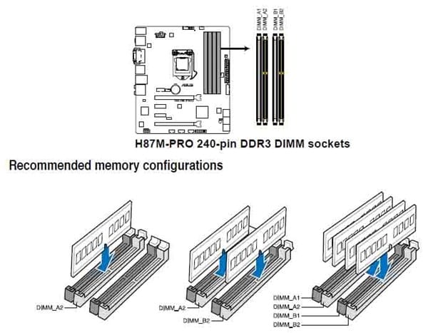 - Es posible instalar diferentes tamaños de memoria en los canales A y B. Los mapas del sistema