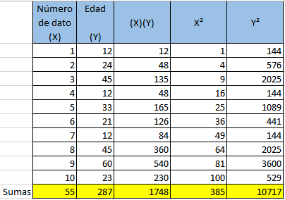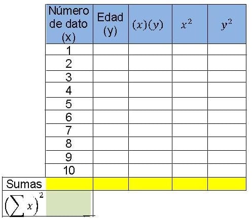 $$\begin{align}&Número de dato (x): Se escriben los números con los que enumeraste los datos.\\&Edad (y): Se escribe la edad que le corresponde a cada dato.\\&(x)(y): Se escribe el resultado de multiplicar el valor de (x) por el valor de (y)\\&x^2:Se escribe el resultado de elevar al cuadrado el valor de (x)\\&y^2 : Se escribe el resultado de elevar al cuadrado el valor de (y)\\&\\&\end{align}$$