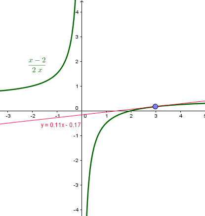 $$\begin{align}&\lim_{x\to 3} \frac{x-2}{2x}= \frac{3-2}{6}=\frac 16\\&\\&\text{Demostrarlo por definición significa encontrar un }\delta\gt 0\\&\text{para cualquier }\epsilon \gt 0\text{ que nos den. De tal forma}\\&\text{que si x cumple }0\lt|x-3|\lt \delta\text{, entoces se cumple}\\&\\&\bigg|\frac{x-2}{2x}-\frac 16\bigg|\lt\epsilon\\&\\&\text{para poder calcularlo primero ponemos esto último}\\&\text{en función de |x-3|}\\&\\&\bigg|\frac{x-2}{2x}-\frac 16\bigg|=\bigg|\frac{3x-6-x}{6x}\bigg|=\bigg|\frac{2x-6}{6x}\bigg|=\frac{|x-3|}{|2x|}\\&\\&\text{Tomaremos un }\delta \text{ primario de valor 1, con lo cual será}\\&\\&0\lt |x-3|\lt 1\\&-1\lt x-3\lt 1\\&2 \lt x\lt 4\\&\\&\text{Demos calcular el máximo de }\frac{|x-3|}{|2x|}\text{ en (2, 4)}\\&\text{lo cual es el máximo de } \frac{3-x}{2x} \;en\; (2,3) \text{ y de } \frac{x-3}{2x}\;en\;(3,4)\\&\\&\frac 3{2x}-\frac 12 \text{ es decreciente, luego el máximo en 2. }Máx_1=\frac 14\\&\\&\frac 12-\frac{3}{2x}\text{es creciente, luego el maxímo en 4. }Máx_2=\frac 18\\&\\&\text{Luego el máximo es }\frac 14\\&\\&\text{Esto significa que si }\epsilon \gt \frac 14\text{ tomaremos }\delta=1\\&\\&\text{Y ahora buscaremos el }\delta \text{ para un }\epsilon\text{ menor}\\&\text{que eso es lo que verdaderamente importa}\\&\\&\text{Si tomamos un }\delta \lt1 \text{ ya vimos que }\\&x\in(2,4)\implies 2x\in(4,8)\implies |2x|\in (4,8)\\&\text{El denominador que más grande puede hacer }\frac{|x-3|}{|2x|}\\&\text{el menor, ya que al dividir por menos toca más, luego}\\&\frac{|x-3|}{|2x|}\le \frac{|x-3|}{4}\\&\\&\text{Resumiendo, si }\epsilon\le \frac 14 \;\text{ tomaremos }\delta \le 1\\&\text{y nos aseguramos que si}\\&0\lt|x-3|\lt \delta\implies \bigg|\frac{x-2}{2x}-\frac 16\bigg|\le \frac{|x-3|}{4}\lt \frac{\delta}{4}\\&\\&\text{luego tomando }\delta =4 \epsilon \text{ tendremos }\bigg|\frac{x-2}{2x}-\frac 16\bigg|\lt \frac{4\epsilon}{4}= \epsilon\\&\\&\text{y por lo tanto se cumple la definición de límite cuando }\epsilon\le \frac 14\\&\\&\text{Y finalmente unificamos la elección de }\delta \text{ para los dos casos,}\\&\text{cuando }\epsilon \gt \frac 14 \text{o cuando }\epsilon\le \frac 14\\&\\&\delta=mín\{1,\;4\epsilon\} \\&\\&\\&\\&\\&\\&\end{align}$$Y ese es el delta. Esa elección indica que en las inmediaciones de x=3 la pendiente es menor de 1/4 = 0.25