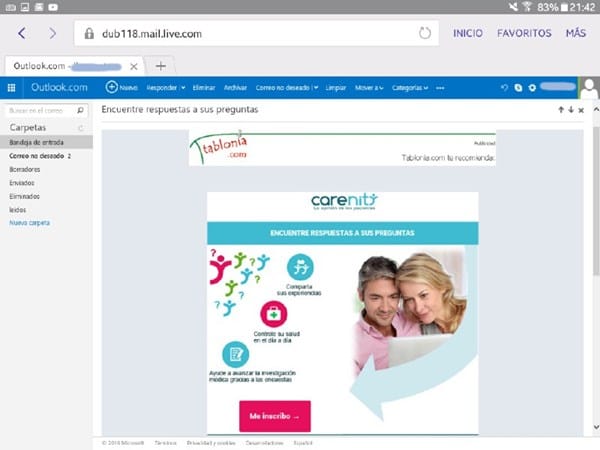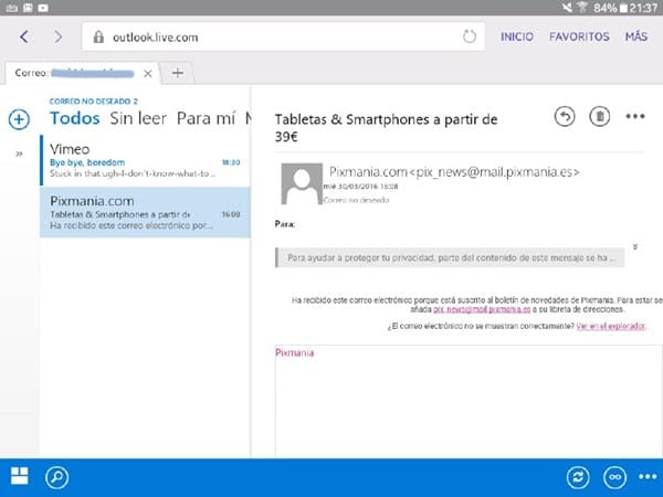 En una foto podéis ver como veo hotmail en la tablet cuando estaba bien, como digo sigo viéndolo así en mis otras dos cuentas, con la barra de herramientas arriba, etc, fácil de usar.