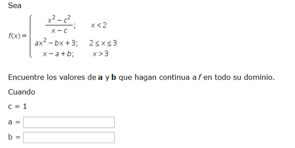 $$\begin{align}&\frac{x^2-1}{x-1}; \qquad x\le 2\\&\\&\lim_{x\to 2^-} \frac{x^2-1}{x-1}= \frac{2^2-1}{2-1}=\frac 31 = 3\\&\\&\text{debemos hacer que el límite por la derecha en 2 sea 3}\\&\\&\lim_{x\to 2^+}f(x)=a·2^2-b·2+3=3\\&\\&4a-2b=0\\&\\&\text{Ahora vamos con los límites en x=3}\\&\\&\lim_{x\to 3^-}f(x) = 9a-3b+3\\&\lim_{x\to 3^+}f(x) = 3-a-b\\&\\&\text{como deben ser iguales}\\& 9a-3b+3=3-a-b\\&10a-2b=0\\&\\&\text{Y juntamos esta ecuación con la que obtuvimos arriba}\\&4a-2b=0\\&10a-2b=0\\&\text{si a la segunda le restamos la primera}\\&6a = 0\\&a=0\\&0-2b=0\\&b=0\\&\\&\text{Luego los valores son}\\&a=0\\&b=0\end{align}$$
