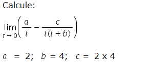 $$\begin{align}&\lim_{t\to 0} \left(\frac at-\frac{c}{t(t+b)}  \right) = \\&\\&a=2,b=4, c=2\times4=8\\&\\&\lim_{t\to 0} \left(\frac 2t-\frac{8}{t(t+4)}  \right)=\infty-\infty\\&\\&\text{es una indeterminación, operaremos la expresión}\\&\\&\lim_{t\to 0} \left(\frac 2t-\frac{8}{t(t+4)}  \right)= \\&\\&\lim_{t\to 0} \left(\frac{2(t+4)-8}{t(t+4)}  \right)=\\&\\&\lim_{t\to 0} \left(\frac{2t+8-8}{t(t+4)}  \right)=\\&\\&\lim_{t\to 0} \left(\frac{2t}{t(t+4)}  \right)=\\&\\&\lim_{t\to 0} \left(\frac{2}{t+4}  \right)= \frac{2}{0+4}=\frac 24 =\frac 12\\&\end{align}$$