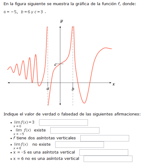 Lim x-->6 f(x) no existe. El 6 es la b. Te diré, para mi es verdadero. Para mí y todos los que estudiaron conmigo con el ilustre profesor José Luis Rubio de Francia un límite solo existe si es finito y es el mismo por los dos lados. Sin embargo en otros sitios he visto que no les importa que sea infinito cono tal sea del mismo signo por los dos lados. Solo existen los límites finitos, los infinitos son formas de decir que la función es grande.