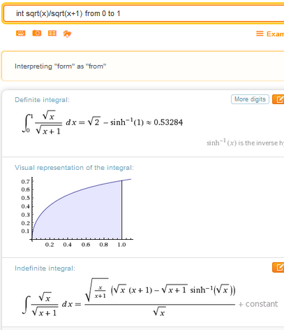 $$\begin{align}&\int_{0}^1 \frac{\sqrt x}{\sqrt{x+1}}dx\\&\\&x=sh^2t\\&dx= 2sh\,t·ch\,t\;dt\\&x=0\implies t=argsh(0)= ln(0+\sqrt{1+0^2})=0\\&x=1\implies t=argsh(1) = ln(1+\sqrt{1^2+1})=ln(1+ \sqrt 2)\\&\\&\text{Ojo, vamos a cambiar los extremos de integración}\\&\text{no hará falta deshacer el cambio para evaluarla}\\&\\&=\int_0^{ln(1+ \sqrt 2)}\frac {sh\,t}{\sqrt{1+sh^2t}}·2sh\,t·ch\,t\;dt=\\&\\&\text{Como }1+sh^2t= ch^2t\\&\\&=\int_0^{ln(1+ \sqrt 2)}\frac {sh\,t}{ch\,t}·2sh\,t·ch\,t\;dt=\\&\\&=2\int _0^{ln(1+ \sqrt 2)}sh^2t\;dt=\\&\\&\text{En la página no te lo pone pero de}\\&ch\,2t=ch^2t+sh^2t\\&-1+ch\,2t=ch^2t-1+sh^2t=sh^2t+sh^2t=2sh^2t\implies\\&\\&sh^2t=\frac{-1+ch\,2t}{2}\\&\\&=2\int_0^{ln(1+ \sqrt 2)}\left(\frac{-1+ch\,2t}{2}\right)\;dt=\\&\\&2\left[-\frac t2 + \frac{sh\, 2t}{4} \right]_0^{ln(1+ \sqrt 2)}=\\&\\&\left[ -t + \frac{sh\, 2t}{2} \right]_0^{ln(1+ \sqrt 2)}=-ln(1+\sqrt 2)+\frac{sh(2ln(1+\sqrt 2)}{2}-0-\frac{sh\,0}{2}=\\&\\&-ln(1+\sqrt 2)+\frac{sh(ln[(1+\sqrt 2)^2]}{2}-0-0=\\&\\&-ln(1+\sqrt 2)+\frac{e^{ln[(1+\sqrt 2)^2]}-e^{-ln[(1+\sqrt 2)^2]}}{4}=\\&\\&-ln(1+\sqrt 2)+\frac{(1+ \sqrt 2)^2-(1+\sqrt 2)^{-2}}{4}\approx\\&\\&0.53283997535355\end{align}$$Y lo que hace falta es comprobar si está bien, para ello echamos mano de la famosa página de Wolfram Alpha