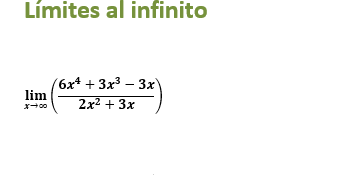 $$\begin{align}&\lim_{x\to \infty} \frac{6x^4}{2x^2}=\lim_{x\to \infty} \frac{6x^2}{2}=+\infty\\&\\&\text{Y si}\text{n usar ninguna de esas cosa ventajosas,}\\&\text{dividiendo todo por }x^2 \text{ es así}\\&\\&\lim_{x\to \infty} \frac{6x^4+3x^3-3x}{2x^2+3x}=\\&\\&\lim_{x\to \infty} \frac{6x^2+3x-\frac 3x}{2+\frac 3x}=\\&\\&\text{Los terminos con numerador constante y }\\&\text{ y denominador }x,x^2, ...\text{ tienden a 0, eso}\\&\text{es de lo poco que te dejan usar. }\\&\text{Y el numerador será suma de dos infinitos}\\&\text{positivos, luego tenderá a }+\infty\\&\\&=\frac{+\infty+\infty-0}{2+0}= \frac{+\infty}{2}= +\infty\end{align}$$Y ya está acabado, ojala lo hayas comprendido todo.