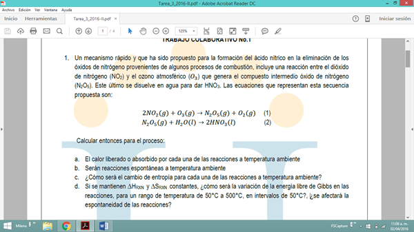 Consulta en la tabla de entropías de formación las correspondientes al NO2, O3, N2O5 y O2.
