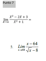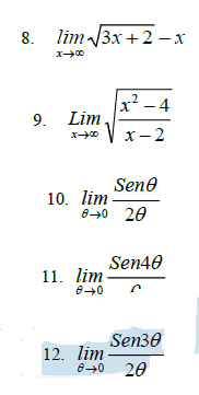 $$\begin{align}&8) \\&\\&L=\lim _{x\to \infty} (\sqrt{3x+2}-x)=\infty-\infty\\&\\&\text{es una indeterminación, multiplicamos} \\&\text{y dividimos por }\sqrt x\\&\\&L=\lim_{x\to \infty}\sqrt x· \frac{\sqrt{3x+2}-x}{\sqrt x}=\\&\\&\lim_{x\to \infty}\sqrt x\left(\sqrt{\frac {3x+2}{x}}- \sqrt x  \right)=\\&\\&\lim_{x\to \infty}\sqrt x\left(\sqrt{3+\frac {2}{x}}- \sqrt x  \right)=\\&\\&\infty(\sqrt{3+0}-\infty) = \infty(-\infty)=-\infty\\&\\&---------------\\&\\&9)\\&\\&\lim_{x\to\infty} \sqrt{\frac{x^2-4}{x-2}}=\\&\\&\text{el numerador es un producto notable}\\&\\&\lim_{x\to\infty} \sqrt{\frac{(x+2)(x-2)}{x-2}}=\\&\\&\lim_{x\to\infty} \sqrt{x+2}= \infty\end{align}$$Y ahí está lo que se puede hacer aquí, acuérdate de puntuar Excelente y mandar los otros límites de dos en dos.