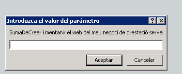 La imagen te lo dice claro: "Introduzca el valor del parámetro" y el parámetro es un "campo" que se llama SumaDeCrear i mentanir el web del meu negocio de prestació servei..."