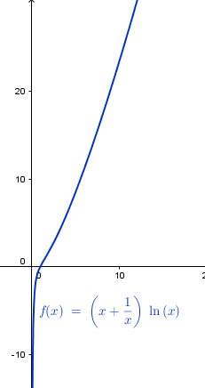 $$\begin{align}&m=\lim_{x\to\infty}\frac{f(x)}{x}\\&\\&\text{y si }m \in \mathbb R-\{0\}\\&\\&b=\lim_{x\to\infty}(f(x)-mx)\\&\\&m=\lim_{x \to \infty} \frac{\left(x-\frac 1x \right)ln\,x}{x}=\\&\\&\lim_{x \to \infty} \frac{\left(x-\frac 1x \right)ln\,x}{x}=\\&\\&\lim_{x\to\infty}\left(1-\frac{1}{x^2}\right)ln\,x=(1+0)·\infty=\infty\\&\\&\text{Luego tampoco hay asíntota vertical}\\&\\&3)\\&f'(x)=\left(1+\frac 1{x^2}\right)ln\,x+\left(x-\frac 1x \right)\frac 1x=\\&\\&\frac{x^2+1}{x^2}·ln\,x+1-\frac 1{x^2}=\\&\\&\frac{(x^2+1)ln\,x+x^2-1}{x^2}\\&\\&\text{calculamos las raíces}\\&\\&Si\; 0\lt x\lt 1\implies \\&lnx\lt 0;\;\;x^2-1\lt 0\implies f'(x)\lt 0\implies decreciente\\&\\&Si \;x=0\implies f'(x)=ln\,0-1=0\\&\\&Si \;x\gt 1\implies\\&ln\,x\gt 0;\;\;x^2-1\gt 0\implies f'(x)\gt 0 \implies creciente\end{align}$$Y esta es la gráfica: