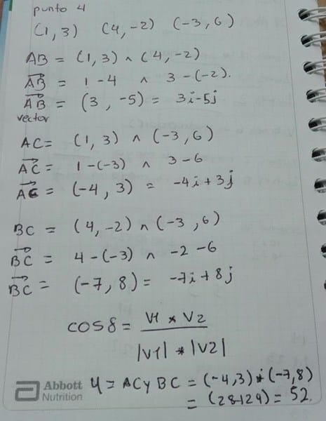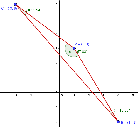 $$\begin{align}&\vec u·\vec v= |\vec u|\;|\vec v|\;\cos(\vec u,\vec v)\\&\\&\cos(\vec u,\vec v)=\frac{\vec u·\vec v}{ |\vec u|\;|\vec v|}\\&\\&\vec{AB}=(4,-2)-(1,3) = (3,-5)\\&\vec{AC}=(-3,6)-(1,3)=(-4,3)\\&\vec{BC}=(-3,6)-(4,-2)=(-7,8)\\&\\&cosA=\frac{\vec {AB}·\vec{AC}}{|\vec{AB}|\;|\vec{AC}|}=\\&\\&\frac{(3,-5)·(-4,3)}{\sqrt{3^2+5^2}\sqrt{4^2+3^2}}=\frac{-12-15}{\sqrt{34}·5}=\\&\\&-\frac{-27}{5 \sqrt{34}}=-\frac{27 \sqrt{34}}{170}\approx -0.9260923598\\&\\&\text{Y comprobamos que}\\&\cos^{-1}(-0.9260923598)=157.8336542\\&\\&\text{luego se corresponde con la gráfica}\\&\\&\\&\\&cosB=\frac{\vec {BA}·\vec{BC}}{|\vec{BA}|\;|\vec{BC}|}=\\&\\&\text{Tener en cuenta que }\vec {BA}=-\vec {AB}\\&\\&\frac{(-3,5)·(-7,8)}{\sqrt{3^2+5^2}\sqrt{7^2+8^2}}=\frac{21+40}{\sqrt{34}·\sqrt{113}}=\\&\\&\frac{61}{\sqrt{3842}}=\frac{61 \sqrt{3842}}{3842}\approx 0.9841270174\\&\\&\text{Y comprobamos }\\&\cos^{-1}(0.9841270174)=10.22216863\\&\text{Está bien.}\\&\\&\\&\\&cosC=\frac{\vec {CA}·\vec{CB}}{|\vec{CA}|\;|\vec{CB}|}=\\&\\&\text{Tener en cuenta que }\vec {CA}=-\vec {AC},\;\vec{CB}=-\vec{BC}\\&\\&\frac{(4,-3)·(7,-8)}{\sqrt{4^2+3^2}\sqrt{7^2+8^2}}=\frac{28+24}{5·\sqrt{113}}=\\&\\&\frac{52}{5 \sqrt{113}}=\frac{52 \sqrt{113}}{565}\approx 0.9783497031\\&\\&\text{Y comprobamos }\\&\cos^{-1}(0.9783497031)=11.94417719\\&\text{Está bien}\end{align}$$
