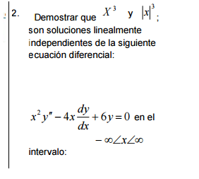 $$\begin{align}&y=x^3\\&y'=3x^2\\&y''=6x\\&\\&x^2·6x-4x·3x^2+6·x^3= 6x^3-12x^3+6x^3=0\\&\\&y=|x|^3\implies \\&y=(-x)^3=-x^3\;si\;x\lt 0,\quad x^3\;si \;x\gt0\\&y'=-3x^2 \;si \;x\lt0,\qquad\qquad 3x^2 \;si \;x\ge0\\&y''=-6x \;si\; x\lt0,\qquad\qquad6x\;si\;x\ge0\\&\\&Si\; x\lt 0\implies \\&x^2(-6x)-4x(-3x^2)+6·(-x^3)=-6x^3+12x^3-6x^3=0\\&\\&Si\;x \gt 0 \implies \text{ Lo mismo que se hizo con }x^3\\&\\&\text{Luego ambas son soluciones de la ecuación}\\&\text{Y son independientes porque no son proporcionales, si}\\&\\&x^3 = k |x|^3\\&\\&\text{la constante k sería -1 para los valores negativos de x}\\&\text{y 1 para los positivos.}\end{align}$$: