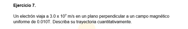 Un electrón viaja a 3.0 x 107 m/s en un plano perpendicular a un campo magnético uniforme de 0.010T. Describa su trayectoria cua