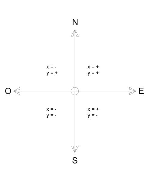 Y la direccción que debe tomar nos la dará el angulo del punto donde está. Para empezar vemos que está en el tercer cuadrante ya que tanto x como y son negativas, eso quiere decir que el arcotangente que nos de la calculadora no sirve, hay que sumarle 180º