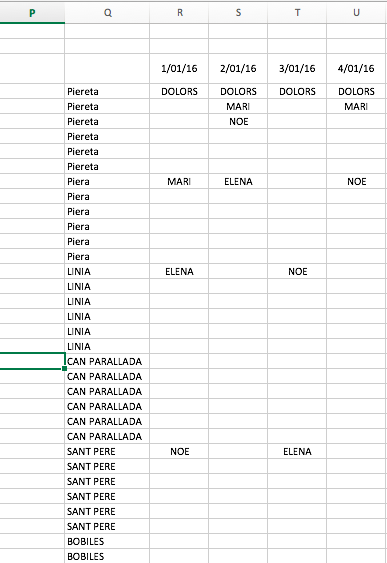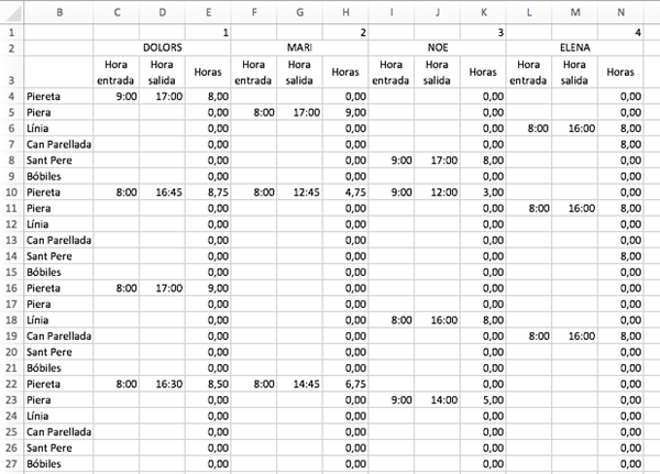 Tengo una hoja de excel donde cada columna es un empleado, y en las filas tengo fechas (cada una repetida 6 veces, para indicar los diferentes establecimientos donde pueden trabajar los empleados). Los datos de la matriz son el horario y las horas a trabajar por cada empleado.
