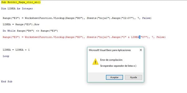 Lo que trato de hacer es básicamente es crear un botón en una hoja de excel (hoja1) que al accionarlo ejecute un código de buscarv (vlookup), este valor encontrado se almacena en la celda "E3", creé una variable llamada "LINEA" que es igual al numero de la fila del valor buscado (LÍNEA = range("E3"). ROw