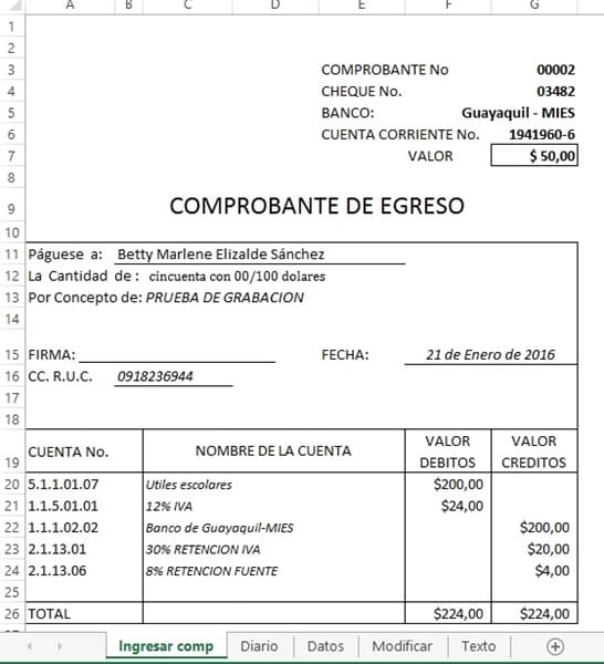 Estoy haciendo una macro que me grabe informacion de una hoja "Ingresar Comp" a 2 hojas distintas, en la primera hoja llamada "Datos" me graba casi todos los datos que quiero pero no se por qué no graba el numero de comprobante y el numero de cheque, y en la otra hoja no sabria como hacerlo para que grabe los datos que quiero que grabe en la hoja "Diario" en la cual puse que datos quiero que grabe en la hoja como ejemplo, espero me puedan ayudar con esta inquietud