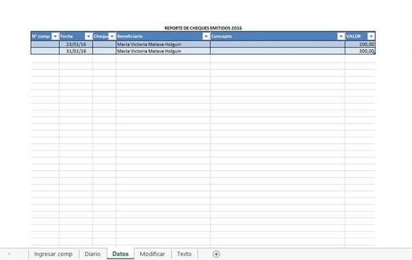 Sub grabar() Hoja2.Activate Application.GoTo Reference:=Range("b65000") Selection.End(xlUp).Select If ActiveCell = "" Then ActiveCell.Offset(-1, 0).Select ActiveCell.Offset(1, 0).Activate ActiveCell.Offset(0, 1) = Hoja4.Range("F15").Value ActiveCell = COMPROBANTE_No ActiveCell.Offset(0, 2) = CHEQUE_No ActiveCell.Offset(0, 3) = Hoja4.Range("B11").Value ActiveCell.Offset(0, 4) = Hoja4.Range("c13").Value ActiveCell.Offset(0, 5) = Hoja4.Range("g7").Value Hoja4.Activate Range("g7,B11:E11,C13:g14,f15,a20:a25,f20:f25,g20:g25").Select Selection.ClearContents Range("g7").Select Application.ScreenUpdating = True Application.GoTo Reference:=Range("G7") End Sub