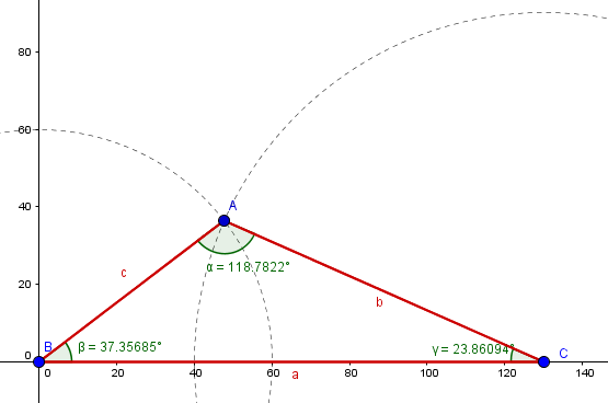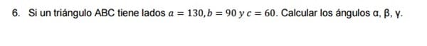 Si un triángulo ABC tiene lados ? = 130, ? = 90 ? ? = 60. Calcular los ángulos α, β, γ.