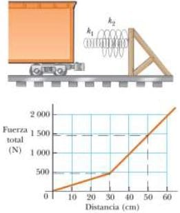 El vagón se lleva al reposo mediante una combinación de dos resortes de espiral, como se ilustra en la figura. Ambos resorte se describen mediante la Ley de Hooke con?1 = 1.60 × 103 N/m y?2 = 3.40 × 103 N/m. Después de que el primer resorte se comprime una distancia de 30.0 cm, el segundo resorte actúa junto con el primero para aumentar la fuerza mientras se presenta una compresión adicional como se muestra en la gráfica. El vagón llega al reposo 20.0 cm después de que empieza a obrar también el segundo resorte.