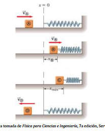 Su constante elástica vale 128 N/m. El bloque tiene masa 0.815 kg y es lanzado hacia el resorte, apoyado en la superficie, con rapidez . Todas las superficies en contacto carecen de rozamiento.