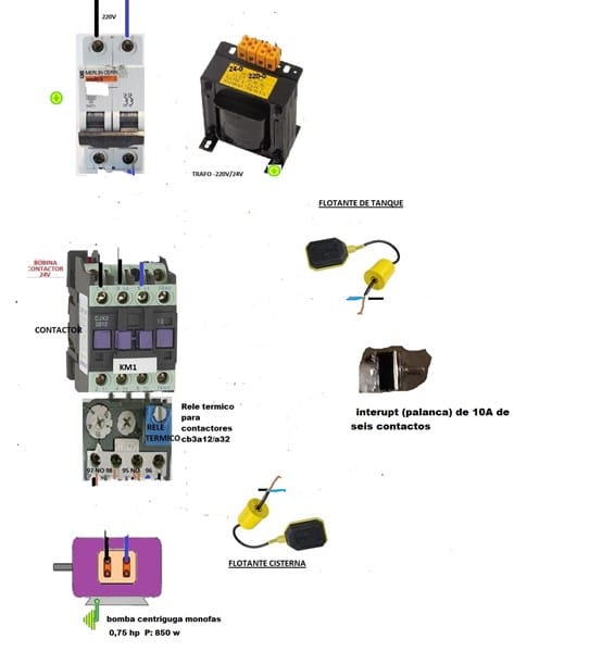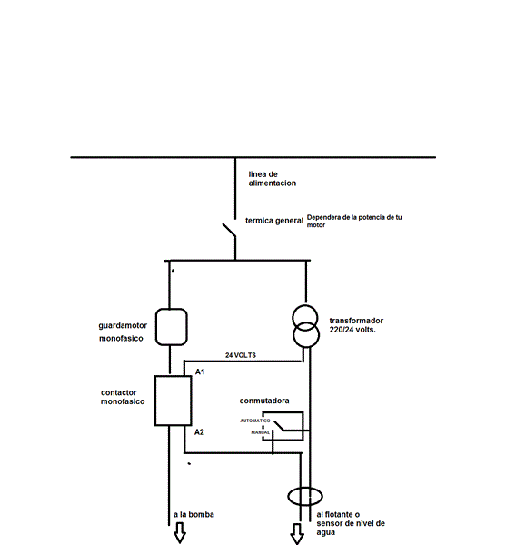 Como conecto una térmica a un trafor 24 v, ¿este a un contactor 24 v con guardamotor también a un interruptor tipo palanca para autmatico y manual .todo a una bomba centrif monofásica de 220 v?