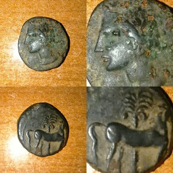 La segunda un calco cartaginés, de cuando Anibal andaba por la península en guerra contra los romanos. El busto es de la diosa Tanit. El caballo típico símbolo de los cartagineses. La palmera símbolo del desierto del que procedían. Está bonita pero tiene oxidaciones. Es menos frecuente que la otra, pero tampoco es demasiado rara. Su precio, unos 30 €. No se te ocurra limpiarla, perdería valor.