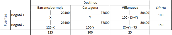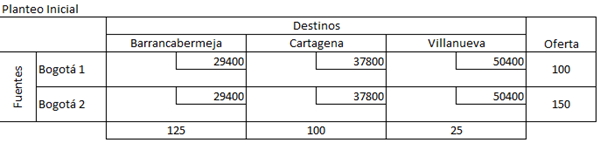 Lo primero que hay que hacer es asegurar que las sumas de las ofertas estén balanceadas con las sumas de las demandas (en este caso ambas dan 250 y están balanceadas)