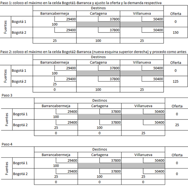 Para esquina noroeste, comenzás por la esquina superior derecha y colocás el mínimo entre la oferta y la demanda (en este caso 100 de oferta), esto descartará toda una fila o columna (en este caso fila) y volvés a plantear el algoritmo con lo que queda (ajustando la oferta y la demanda, afectadas por el punto anterior). Te dejo el paso a paso de este método porque es elemental que lo entiendas para después poder profundizar con otros métodos.