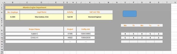 Me gustaría obtener una macro que ubique al empleado ( C5 ) en la lista desplegable y lo busque en la lista de todos los empleados que esta en B23:B43, busque los proyectos a los que esta cargando horas ( B11 y B13 ), las horas se colocaran manualmente en las celdas (para B11, O11:S11 y para B13, O13:S13), de lunes a viernes correspondientemente.