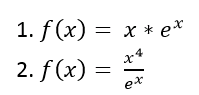 $$\begin{align}&\text{1) La fórmula que necesitarás es:}\\&\\&(f\,g)'=f'g+fg'\\&\\&f(x)=xe^x\\&f'(x)=1·e^x+x·e^x=e^x+xe^x=e^x(1+x)\\&\\&\\&\text{2) Y aquí necesitas esta otra}\\&\\&\left(\frac fg \right)'=\frac{f'g-fg'}{g^2}\\&\\&f(x)=\frac{x^4}{e^x}\\&\\&f'(x)= \frac{4x^3·e^x-x^4·e^x}{(e^x)^2}=\frac{e^x(4x^3-x^4)}{(e^x)^2}=\\&\\&\frac{4x^3-x^4}{e^x}\end{align}$$Salu_dos.
