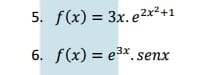 $$\begin{align}&(f+g)'=f'+g'\\&(f·g)'=f'g+fg'\\&(f[g(x)])'=f'([g[x)]·g'(x)\\&\\&(x^n)' = nx^{n-1}\\&(e^x)'=e^x\\&(sen\,x)'= \cos x\\&\\&5) f(x) = 3x·e^{2x^2+1}\\&\\&f'(x) = (3x)'·e^{2x^2+1}+3x·\left(e^{2x^2+1}\right)'=\\&\\&3e^{2x^2+1}+3x·e^{2x^2+1}·(2x^2+1)'=\\&\\&3e^{2x^2+1}+3x·e^{2x^2+1}·4x=\\&\\&3e^{2x^2+1}+12x^2e^{2x^2+1}=\\&\\&\text{Y se puede sacar factor común}\\&\\&= 3e^{2x^2+1}(1+4x^2)\\&\\&\\&6) f(x)=e^{3x}sen\,x\\&\\&f'(x)=\left(e^{3x}\right)'senx+e^{3x}(sen x)'=\\&\\&e^{3x}·(3x)'·sen\,x+e^{3x}·\cos x=\\&\\&e^{3x}·3·senx+ e^{3x}\cos x=\\&\\&\text{sacamos factor común}\\&\\&e^{3x}(3\,senx+cosx)\end{align}$$:
