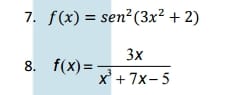 $$\begin{align}&(f+g)'=f'+g'\\&(kf(x))' = k·f'(x)\\&(f·g)'=f'g+fg'\\&\left( \frac fg\right)'=\frac{f'g-fg'}{g^2}\\&(f[g(x)])'=f'([g[x)]·g'(x)\\&(x^n)' = nx^{n-1}\\&(sen\,x)'= \cos x\\&\\&\\&7) f(x)=sen^2(3x^2+2)\\&\\&f'(x)= 2·sen^{2-1}(3x^2+2)·[sen(3x^2+2)]'=\\&\\&2sen(3x^2+2)·\cos(3x^2+2)·(3x^2+2)'=\\&\\&2 sen(3x^2+2)·\cos(3x^2+2)·6x=\\&\\&12x·sen(3x^2+2)·\cos(3x^2+2)=\\&\\&\text{haz esto solo si has dado trigonometría avanzada}\\&\\&=6x·sen(6x^2+4)\\&\\&\\&8) f(x)= \frac{3x}{x^3+7x-5}\\&\\&f(x)= 3·\left( \frac{x}{x^3+7x-5} \right)'=\\&\\&3· \frac{x'·(x^3+7x-5)-x·(x^3+7x-5)'}{(x^3+7x-5)^2}=\\&\\&3·\frac{1(x^3+7x-5)-x·(3x^2+7)}{(x^3+7x-5)^2}=\\&\\&3·\frac{x^3+7x-5-3x^3-7x}{(x^3+7x-5)^2}=\\&\\&3·\frac{-2x^3-5}{(x^3+7x-5)^2}=\\&\\&\text{y creo queda mejor así}\\&\\&-\frac{6x^3+15}{(x^3+7x-5)^2}=\\&\\&\\&\\&\end{align}$$Y eso es todo, Salu_dos.