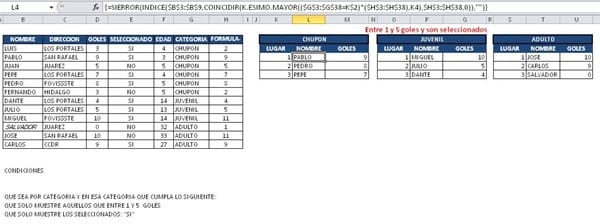 Del archivo que me apoyaste ahora existen más condiciones que se deben cumplir para obtener el 1, 2 y 3 lugar de cada categoría (Chupón, Juvenil y Adultos). Bien, esta es la imagen de lo que se quiere, los resultados mostrados en la imagen son con la fórmula que me apoyaste que aun no incluye las condiciones y por lo tanto son erróneos.