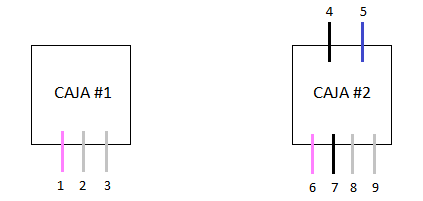 En la caja #2 los cables negro y azul suben hasta el punto de luz (la instalación es de los años 70.. Creo que nos neutros actualmente no funcionan así). No tengo del todo claro si los cables grises se deberían unir en el extremo #2 o si hay que condenar uno de ellos y hacer participar al otro en el esquema. ¿Cuál sería la combinación completa de cables? Teniendo en cuenta que en la caja #2 solo habrá un enchufe.