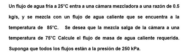 Un flujo de agua fría a 25°C entra a una cámara mezcladora a una razón de 0.5 kg/s, y se mezcla con un flujo de agua caliente